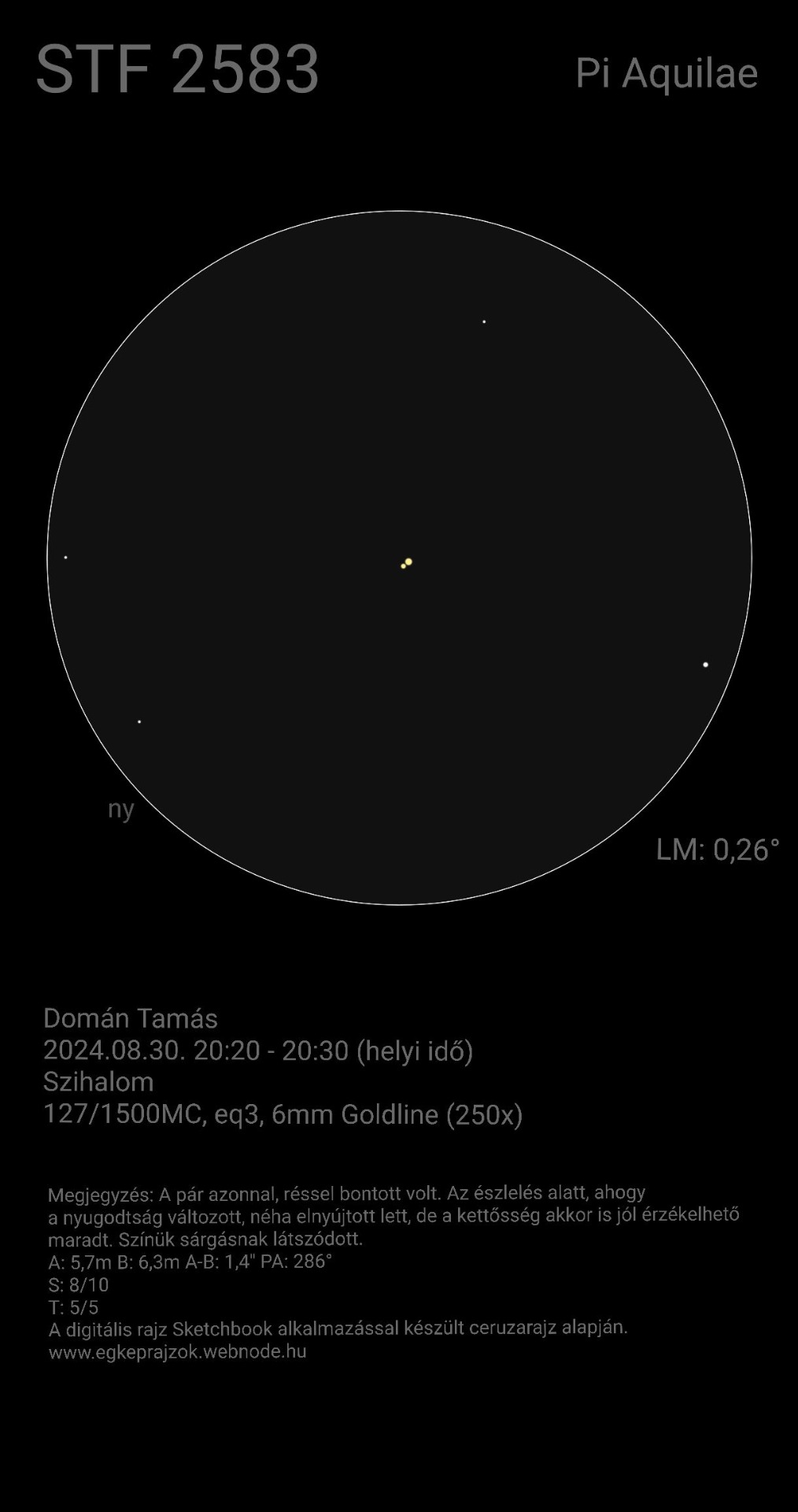 A hattyú csillagkép egyik látványos többszörös rendszere az STF 2762. Már közepes nagyítással is érdemes felkeresni. Bár az A és B 3,3" szeparációja elég szorosnak mondható és az A 5,7m fényessége mellett a B-C-D kísérők elég halványak a 127MC al 167X nagyítással jól láthatóan bontott a rendszer. Mind a 4 csillaga szépen kivehető.