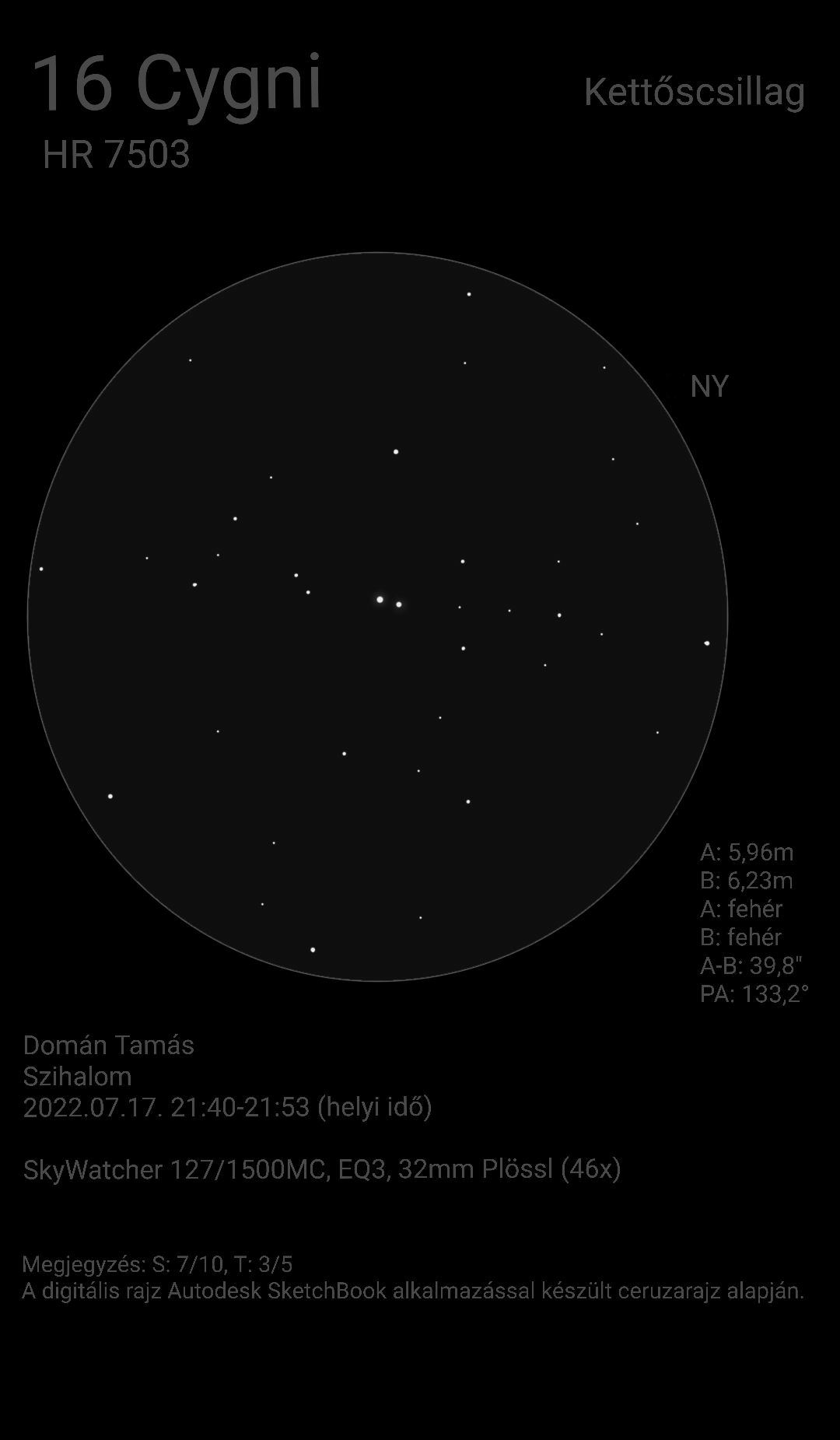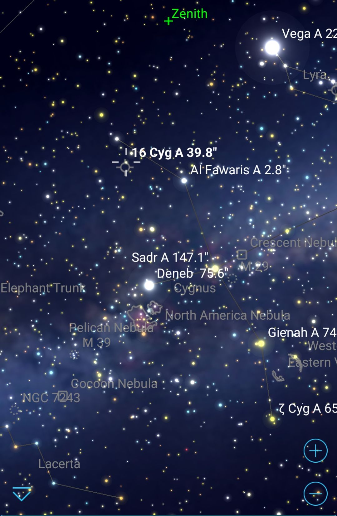 A 16 Cygni t már kistávcsővel is érdemes felkeresni, hiszen kis nagyításon is jól bontható kettősről van szó. A közel azonos fényesség és a nagy szeparáció valamit az elhelyezkedése miatt kezdőknek is jó célpont lehet. A csillagok színe fehér, környezetében sok csillag látszik.