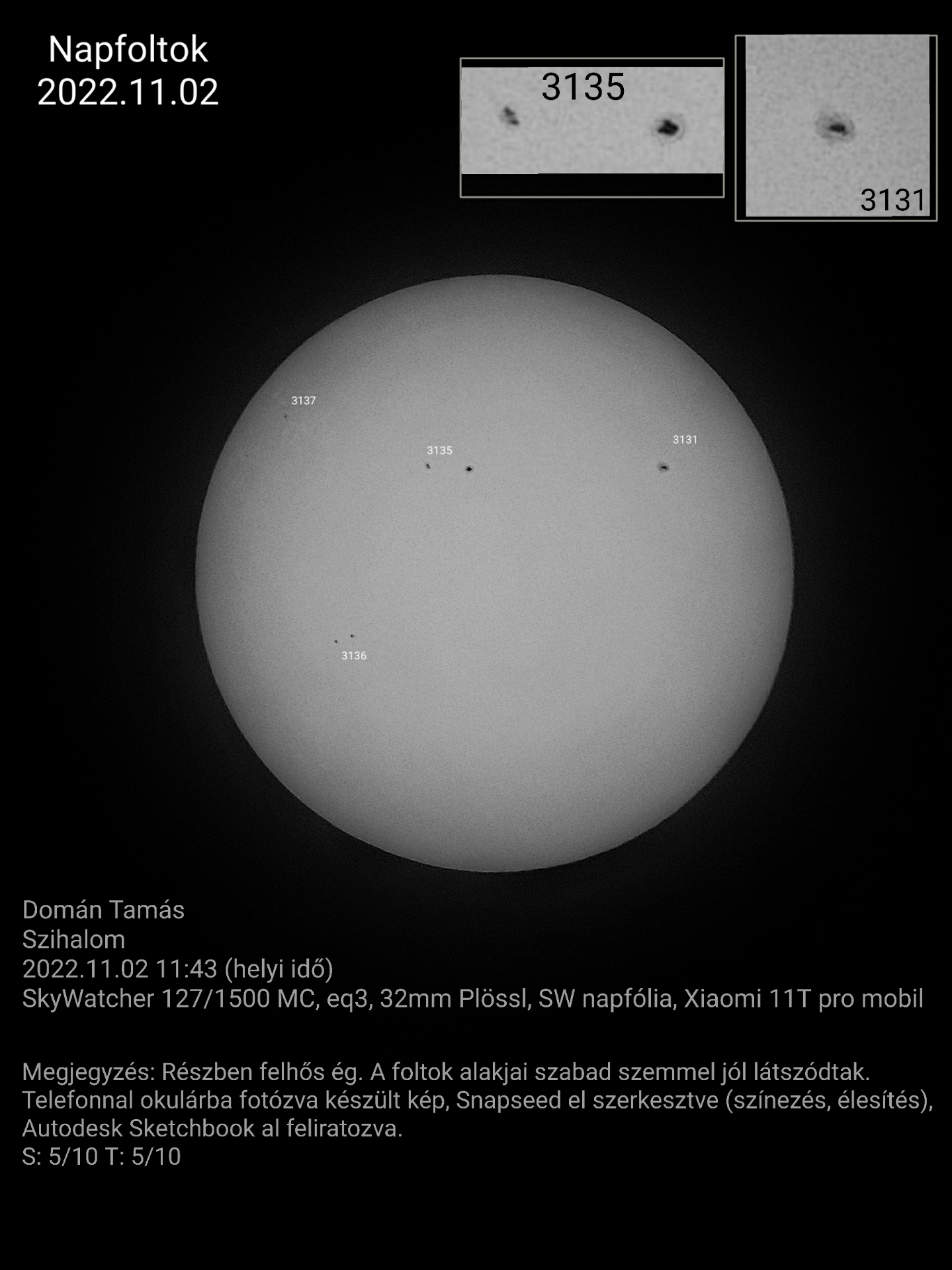 Változóan felhős ég alatt kezdtem el a napészlelést. Vizuálisan szépen látszódtak a napfoltok alakjai 47x nagyítás mellett, de most nem terveztem rajzos észlelést. Mobiltelefonnal az okulárba fotózva készült a mellékelt kép. A részletek (3135 és 3131) az eredeti kép kinagyított részlete.
