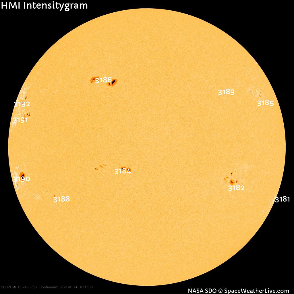 A mai észlelés körülményei nagyon rosszak voltak (ez a képen is meglátszik). Felhős párás ég, néha átszűrődő fénnyel és néha úgy ahogy látszó nappal. Az átlátszóság 2/5, a nyugodtság 7/10. Mivel nem jósoktak mára sem jó eget az észleléshez, ezért kihasználva ezt a pár percet amit az ég engedett készítettem ezt a fotót. A korábbi észleléshez képest láthatóak a változások. Ha esetleg derült lesz még a nap folyamán, akkor lesz egy új kép. Bal oldalt látható új folt a 13190 már egész jól megfigyelhető lenne. A 13186 változásai is jól láthatóak, ahogyan a 13182 és 84 es is.