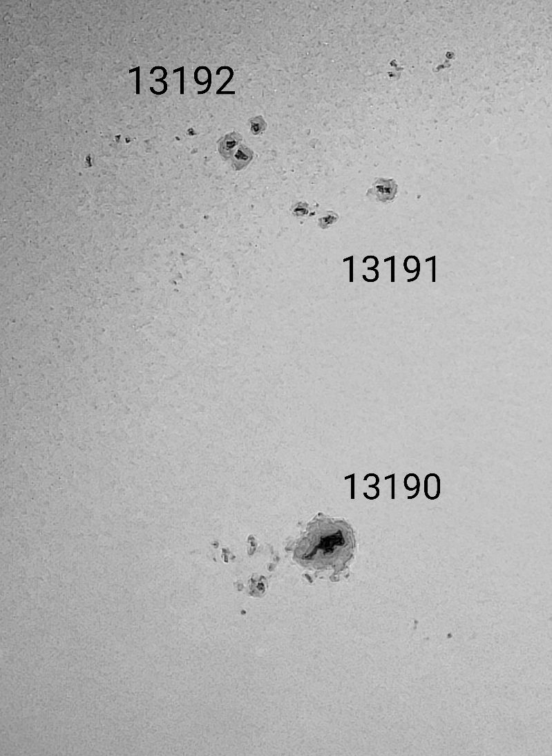 2023.01.17. én délelőtt bár nagyon felhős volt az ég, mégis kivittem a felszerelést, ha a későbbiekben nem lesz derült, néhány képet tudjak készíteni. Sajnos a vizuális észlelés teljesen elmaradt, másodpercekre volt csak derült égrész. Az első teljes napkorong fotó és a részlet akkor készült. 11:30 kor. Már ennek is örültem, hiszen ismét "láthattam" a 13190 es foltot. Aztán fél egy körül a felhők kezdtek elvonulni, több időt hagyva az észlelésnek, így délután 12:45 kor ismét készítettem egy fotót (a második teljes napkorong kép). Itt már a fáklyamezők is jobban látszódnak, bár talán vannak foltok amik kevésbé. Délelőtt a nyugodtság kb 5/10 az átlátszóság pedig 1/5 volt kb 5 fokos hőmérséklettel. Délutánra a nyugodtság 7/10 az átlátszóság 3/5 re változott. A fotókhoz megadott időpont helyi idő.