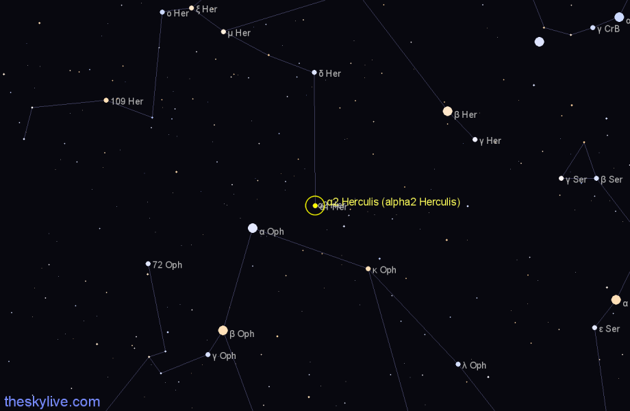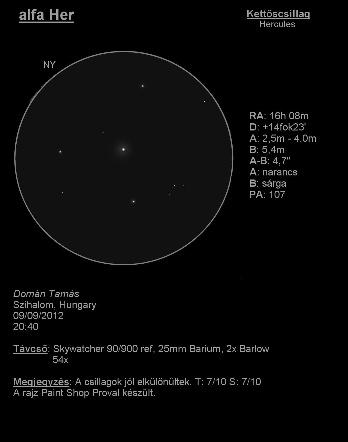 Az Alpha Herculis egy hármas csillagrendszer. A három csillag közül az elsődleges (legfényesebb), amelyet α1 Herculisnak vagy α Herculis A - nak neveznek, egy pulzáló változócsillag az aszimptotikus óriáságon (AGB), és a Mira után a második legközelebbi AGB-csillag. Az elsődleges csillag vizuális bináris párt alkot egy második csillaggal, amely maga is egy spektroszkópiai bináris. Összesített látszólagos fényessége 3,08, bár ez változó. Megtalálása nem nehéz, közepes nagyítással bontható az A-B tag. Színei narancs és sárga volt a refraktorban. Ugyanez a Makszutovban inkább sárga és sárga.