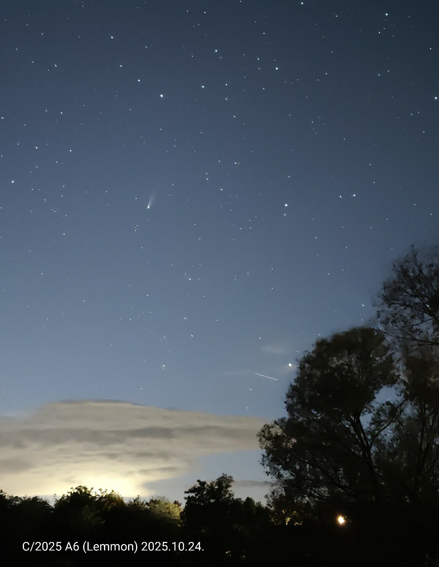 A C/2025 A6 (Lemmon) üstököst időhiány miatt csak 2025.10.19.-én sikerült először észlelnem. Mivel akkor és október 24.én is csak mobiltelefonos képeket készítettem, más megfigyelésre, rajzra nem is készültem egyik esetben sem így, ha az időjárás és az elfoglaltság engedi egy binokuláros/rajzos észlelés még mindenképp hátra van. Az itt megosztott kép 24.én készült erősen szeles időben egy Xiaomi 15 Ultra mobiltelefonnal. Pontosabban ez a kép, az elkészült fénykép egy kivágott részlete csupán, hogy az üstökös a kép nagyítása nélkül is könnyen látható legyen. Az eredeti kép 12mp jpg, 15mp expo és iso 4000 beállításokkal készült. Szerkesztésmentes, csak a kivágás és a felirat került rá.