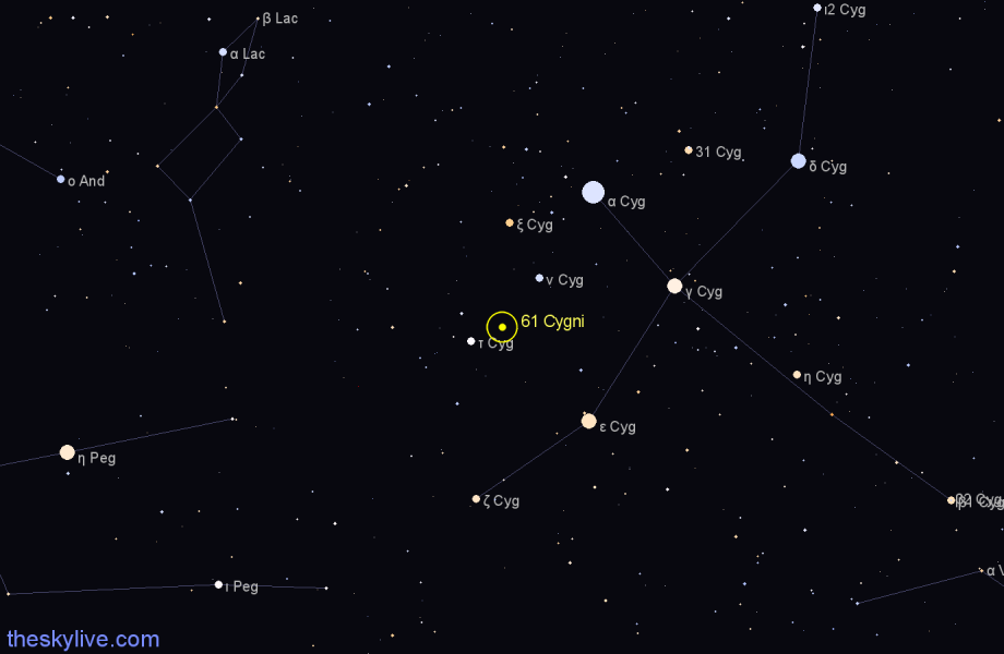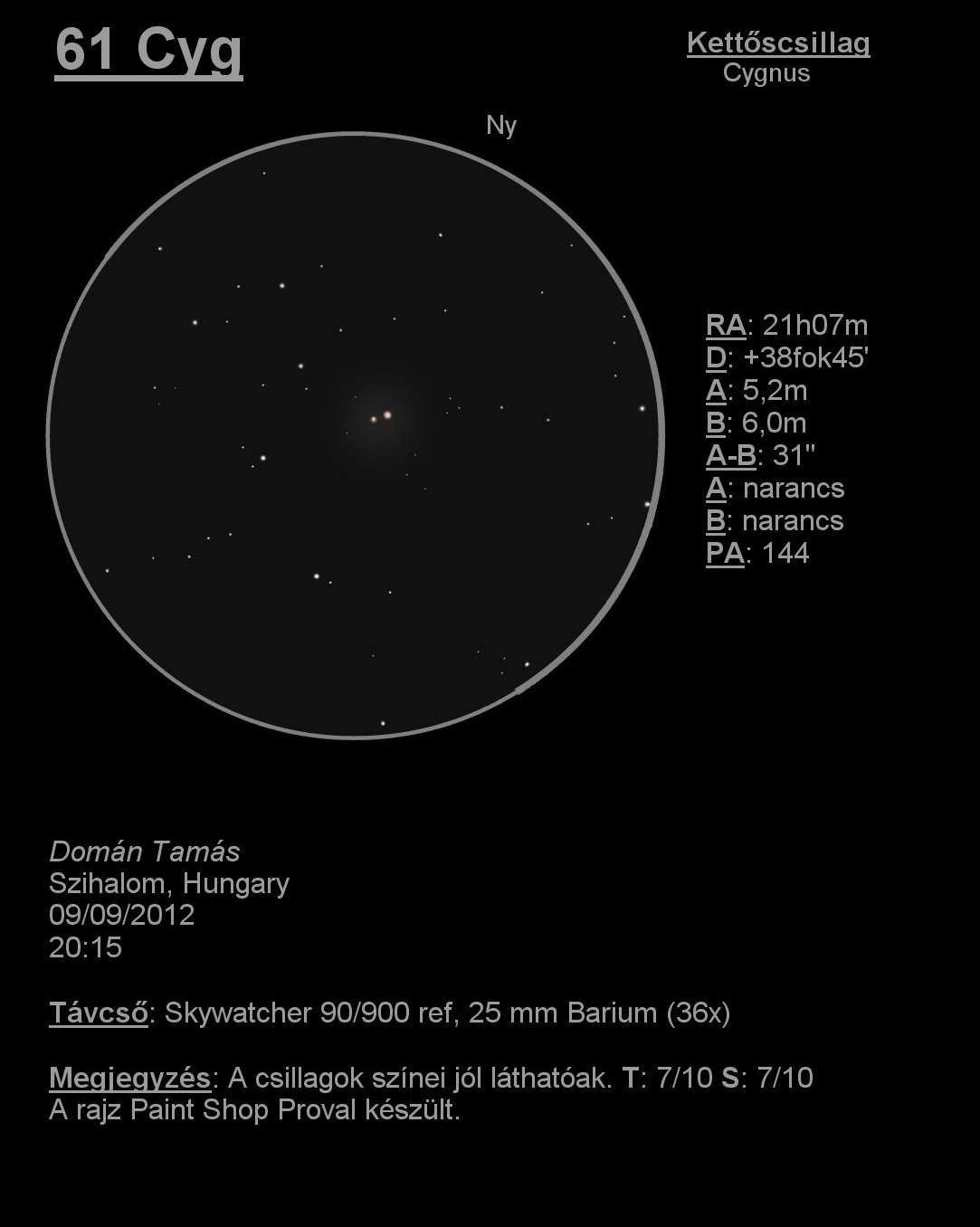 61 Cygni a Cygnus csillagkép kettős csillagrendszere , amely egy K-típusú törpecsillag párból áll, amelyek körülbelül 659 éves periódusban keringenek egymás körül. Látható magnitúdójuk 5,20 és 6,05. Könnyen bontható a nagy szeparáció miatt. Nem igényel nagy nagyítást, ahogy nagy átmérőjű távcsövet sem. Emiatt a nagy LM s észleléssel jól megfigyelhető a kettős környezete is.