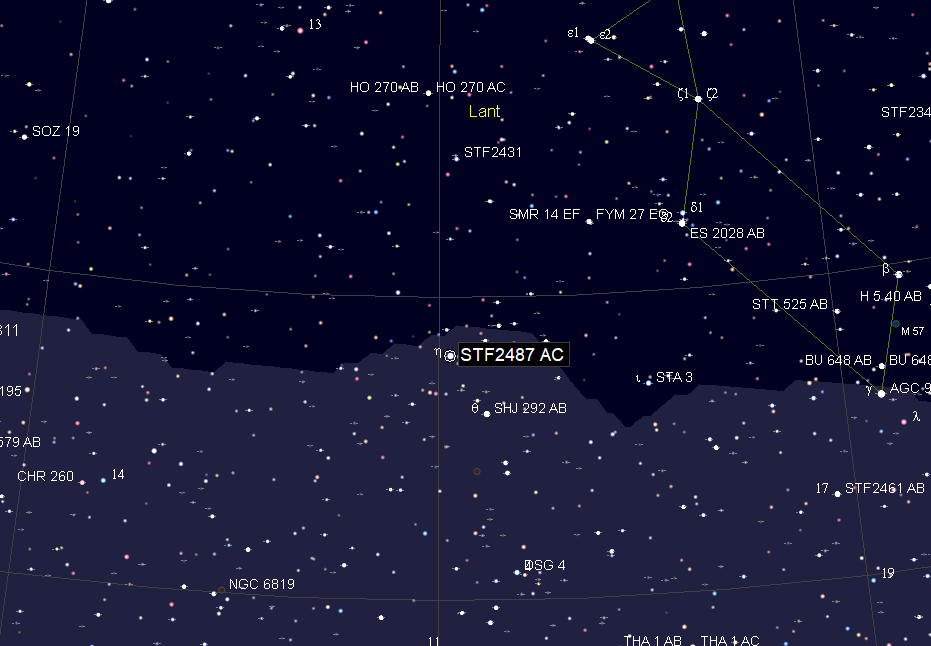 Az STF 2487 egy többszörös rendszer a Lant csillagképben. Felbontása már kis távcsővel is könnyen sikerülhet. Tőle nem messze található az SHJ 289 kettős, szintén tág szeparációval. 167x nagyítás mellett nálam kényelmesen elfértek egy látómezőben. Mindkét esetben fehéres fő és kék kísérő csillag látszott.