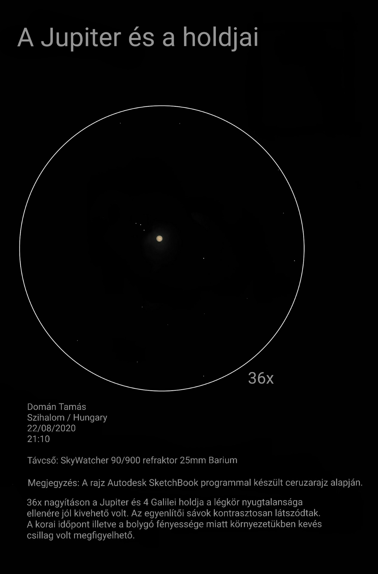 A Jupiter és a holdjainak látványa kis nagyítással. A bolygó egyenlítői sávja már 36x nagyításon jól kivehető, ahogy a 4 Galilei holdjainak a helyzete is könnyen megfigyelhető. A Jupiter fénye ezen a nagyításon még nem nyomja el a környező csillagokat, így láthatóak a LM ben.