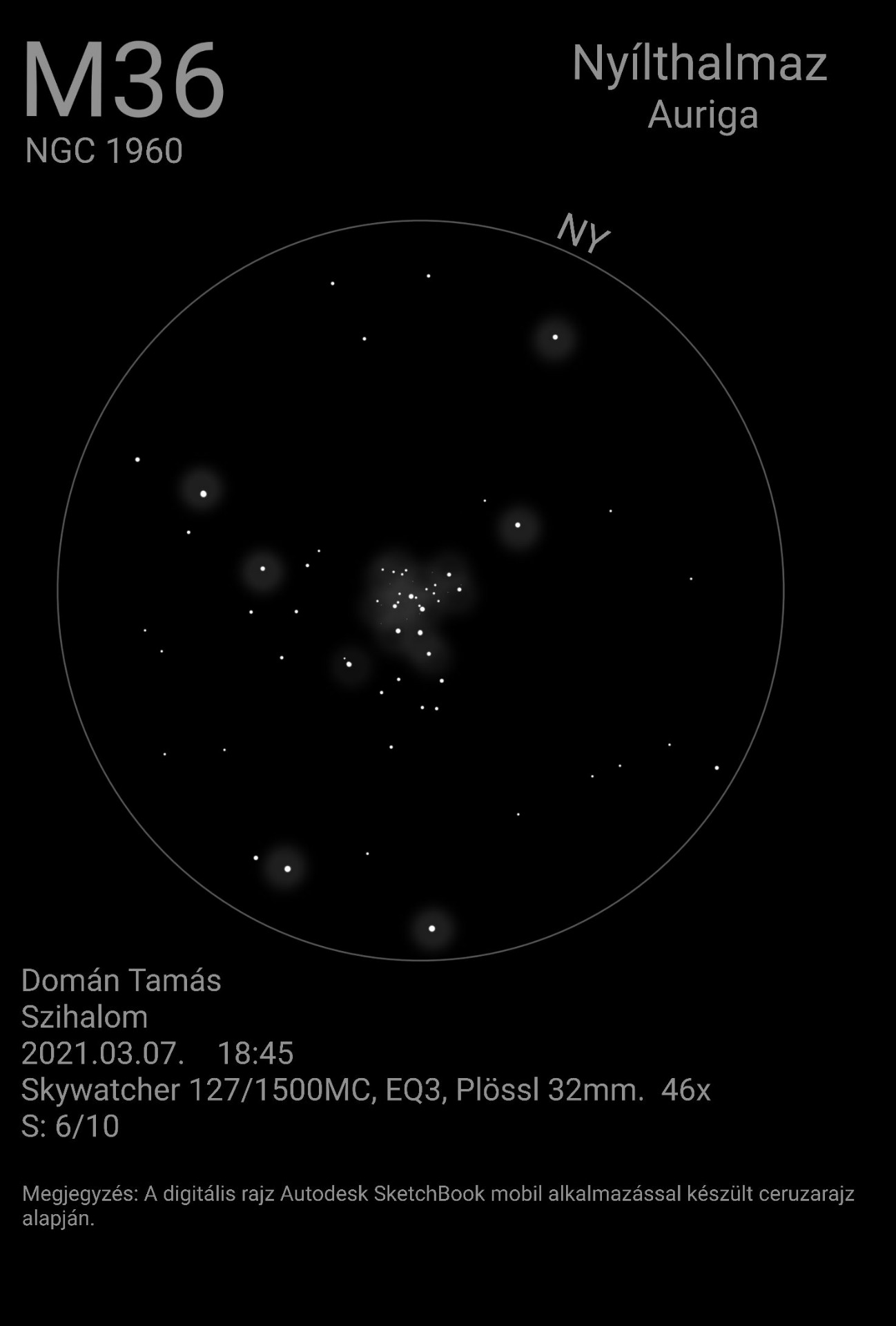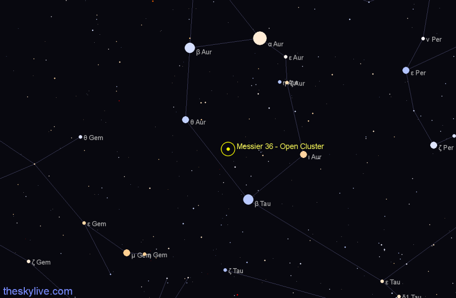 Az M36 nyílthalmazt Giovanni Battista Hodierna fedezte fel 1654-et megelőzően. Charles Messier francia csillagász 1764. szeptember 2-án katalogizálta. Az M36 egyike a három fényes nyílthalmaznak, melyek a Szekeres csillagkép déli részén találhatóak, és szerepelnek Messier katalógusában. A másik kettő az M37 és az M38