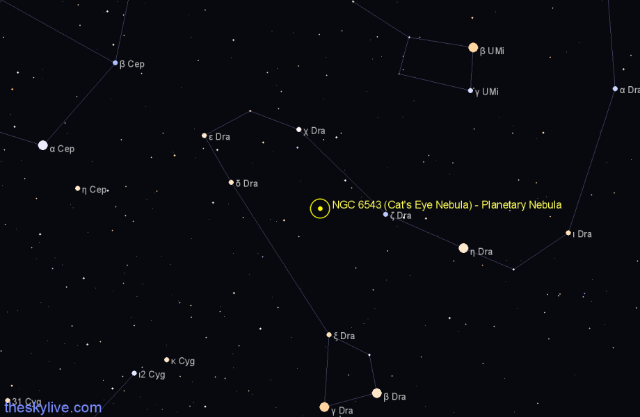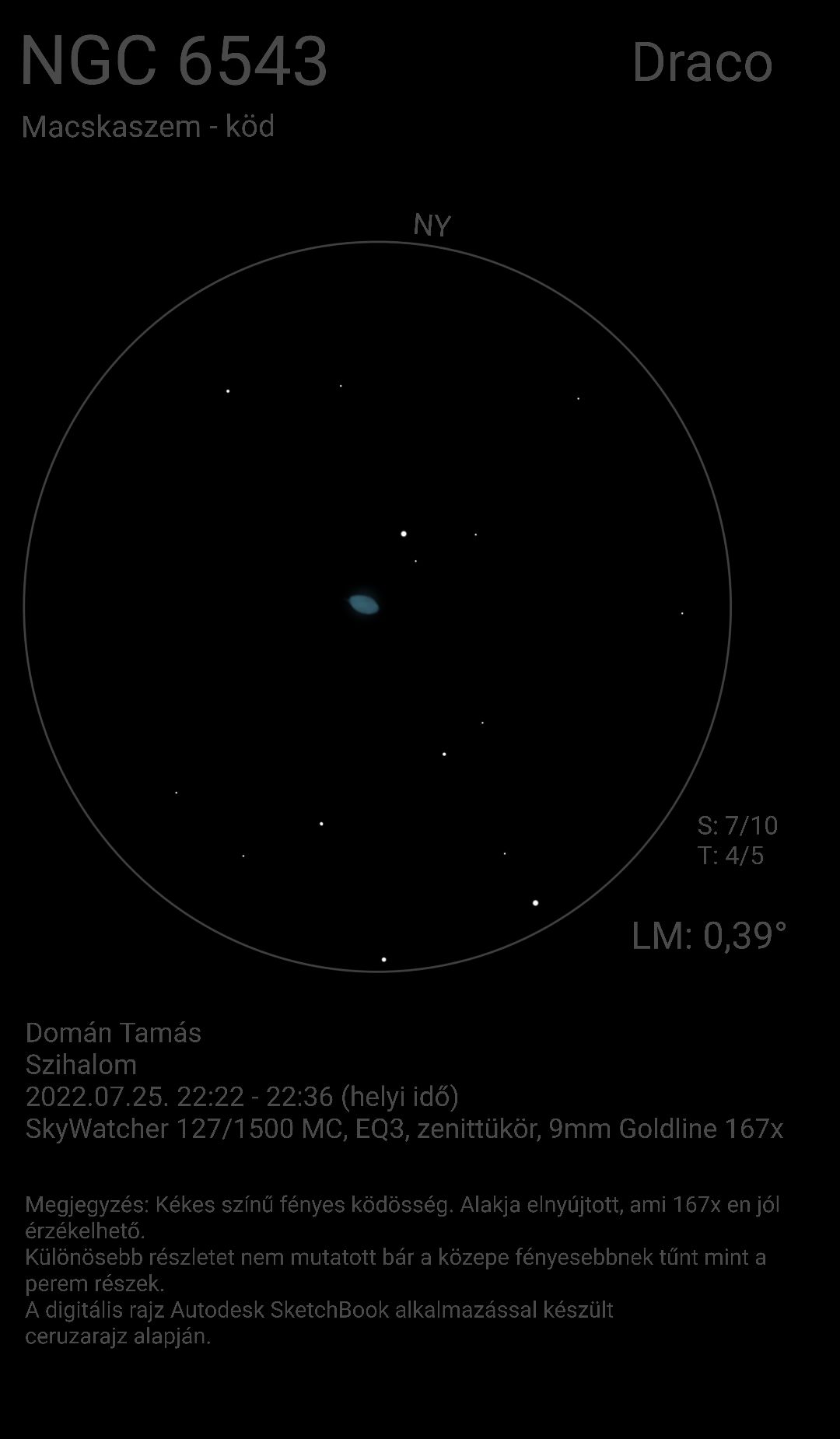 Az NGC 6543 egy könnyen megtalálható mély - ég objektum ( Planetáris - köd ) a Sárkány csillagképben. Már kis nagyításon is látható, hogy nem csillag. Kiterjedtebb, nem pontszerű. 46x nagyítás mellett inkább korong formája volt, de a nagyítást növelve 167x ig már elnyúlt alakja volt. Olyan mint egy macskaszem. Színe jól látszott kis és nagy nagyításon is. Halványkékes. A környezetéből jól kitűnt fényes oblyektum, a középrésze fényesebb a kölső részeinél, de részletek nem voltak láthatóak. William Herschel fedezte fel 1786. február 15-én.