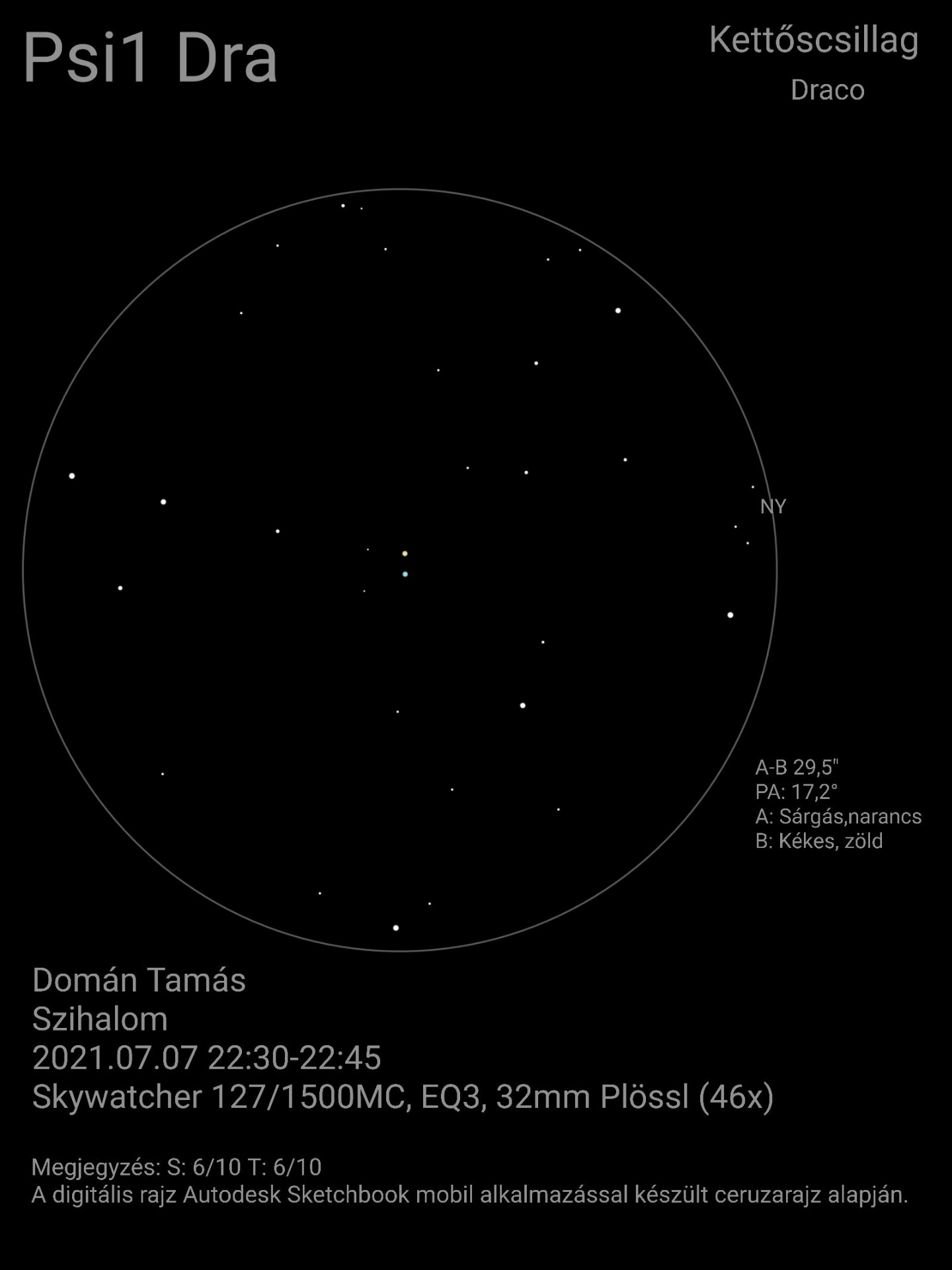 Kis nagyítással bontható páros, így a bővebb csillagkörnyezete is beleférhet a látómezőbe amiben a Sárgás narancsos és Kékes zöld csillagok nem túl hivalkodó színeikkel is csodás látványt nyújtanak. Megtalálása egyszerű. Akik szeretik az eltérő színű kettősöket mindenképp keressék meg a Psi1 Draconist.