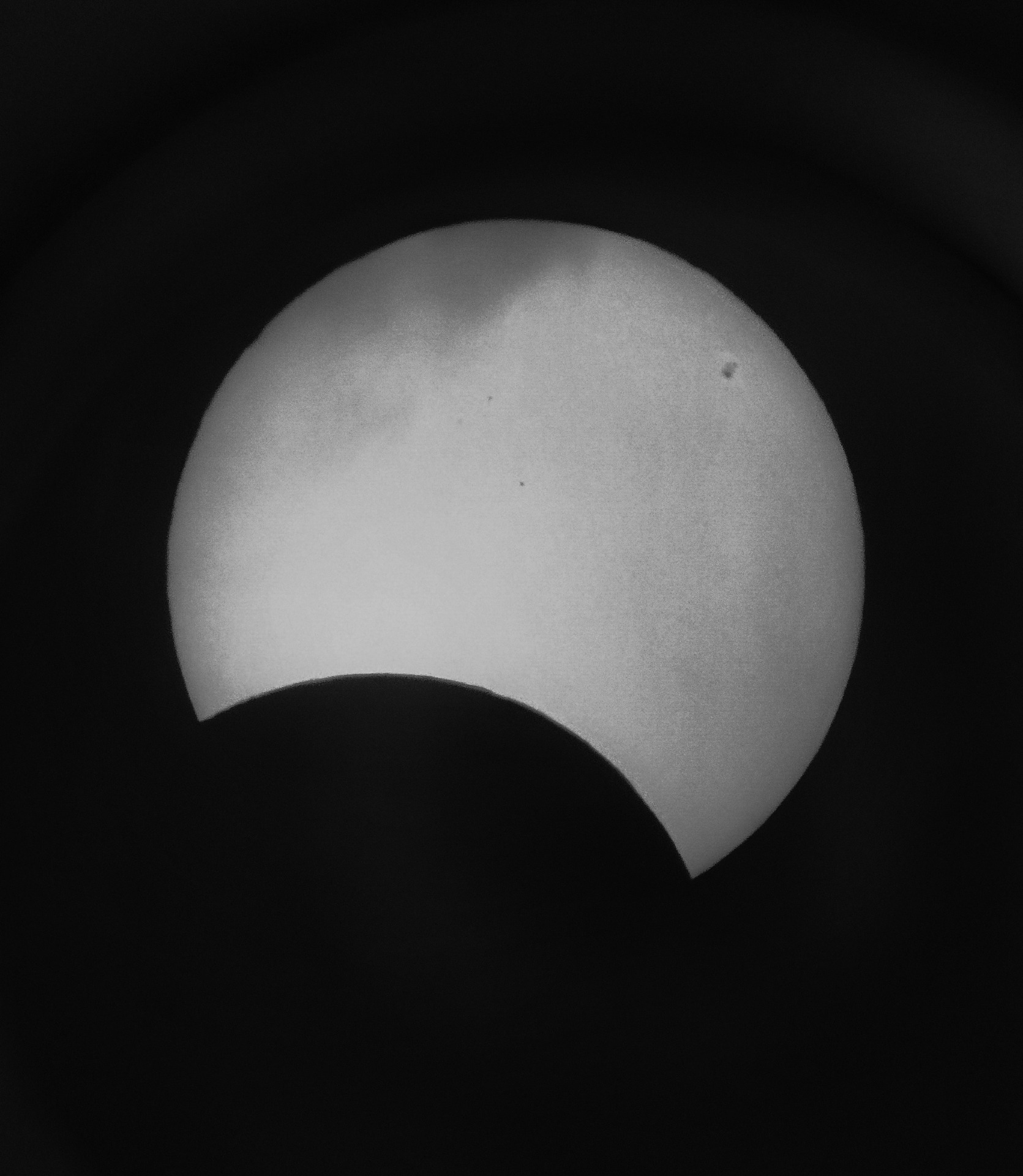 12:55 kor jött egy átmeneti javulás. Egy apróbb rés a felhőzeten, így azonnal elindult a nap megkeresése a távcsővel, a telefon felhelyezve az okulárra és igen... Siker. Ott van, látni. :) Sajos csak 2 perc adatott, majd ismét felhők takarták el csillagunkat, de így is sikerült néhány, sajnos nem túl éles fotón megörökíteni a jelenséget. Szabad szemmel (távcsőn és napfólián keresztül) is jutott pár másodperc, hogy megcsodáljam a Hold peremvidékének csipkézettségét a Nap előterében és az épp aktuális napfoltokat.