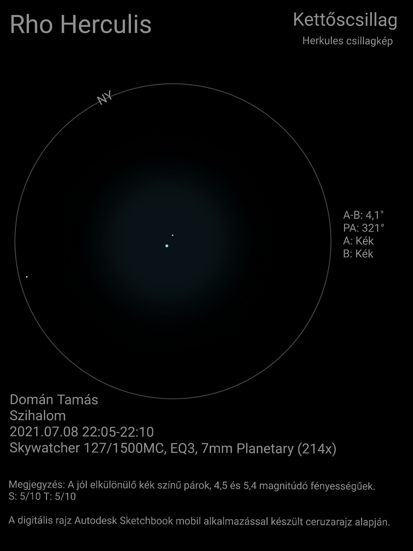 A Rho Herculis komponenseinek kis fényességkülönbségük miatt látványosabb az olyan kettősöknél ahol a kísérő nagyon halvány. Igaz ez utóbbiak észlelése nagyobb kihívás. A Rho Herculis nagyon szép kék színű páros. Nagyobb nagyítással könnyen bontható.