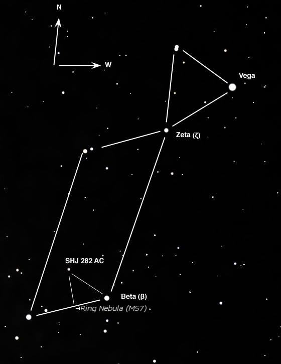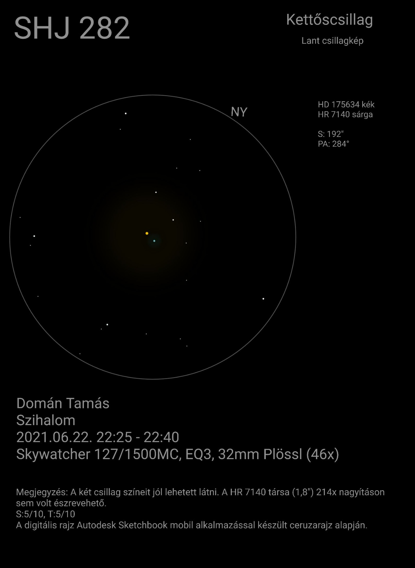 Az SHJ 282 egy újabb és szép kettőscsillag a Lant csillagképben. Talán kevésbé ismert a "kettős kettősök" mellett és a kék és sárga párosok között sem a legelső ami az amatőrcsillagászoknak eszébe jut. Az élénk és szintén kék sárga Beta Cygni (Albireo) mellett viszont mindenképp érdemes felkeresni ezt a párost is. Másabb csillagkörnyezet, kissé eltérő színei nagyon látványosak. Nem igényel nagy nagyítást, bár a HR 7140 kísérőjét már nem annyira egyszerű észrevenni. A rajz készítésekor 214x nagyítással nem láttam. Talán egy jobb ég alatt legközelebb sikerül.