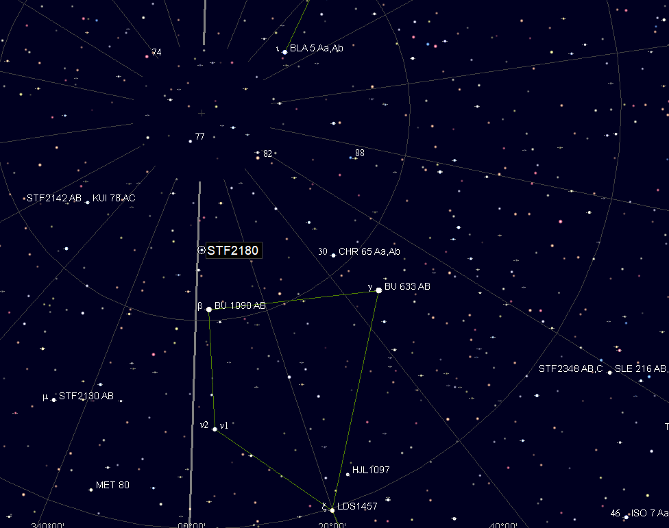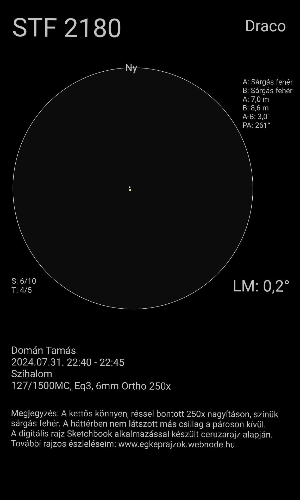 A Sárkány csillagkép egyik kettőse az STF 2180. A tagok sárgás fehéres színűek, jól kereshetőek. Az észleléskor 250x nagyítással a kettősön kívül nem láttam a háttérben csillagokat, de így is szép látványt nyújtottak. Az A és B könnyen elkülönült.