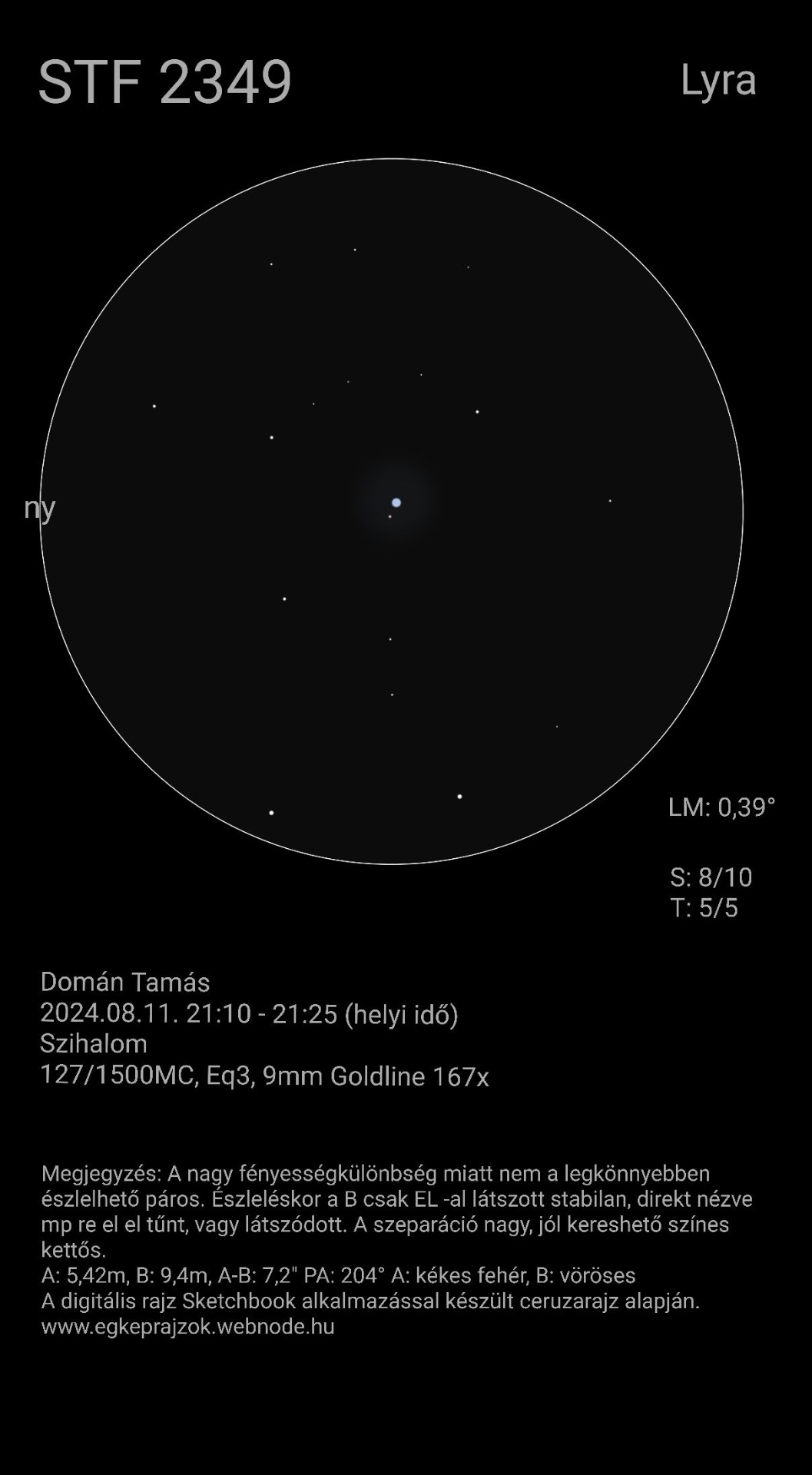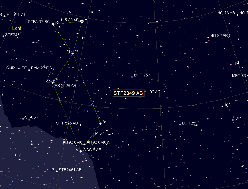 Az STF 2349 egy nagy fényességkülönbségű páros a Lant csillagképben. Könnyen kereshető, nagy szeparációval a tagok között. Észlelésének nehézségét a főcsillag és a kísérő közötti fényességkülönbség okozza ( 5,4m, 9,4m). 167x nagyítás mellett a B csak elfordított látással látszódott stabilan. Direkt nézve másodpercekre el el tűnt. Színük kékes fehér és vöröses.