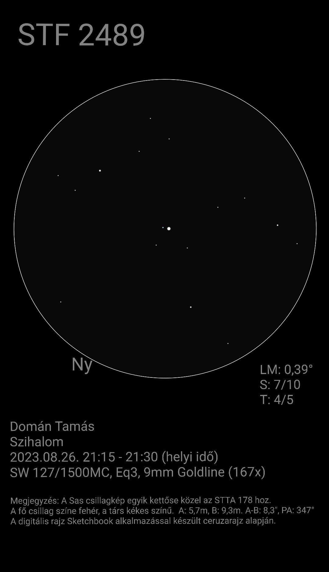 A Sas csillagkép egyki kettőse, ami talán annyira nem izgalmas, mégis érdemes felkeresni. Közel található az STTA 178 hoz. Nagyobb nagyítással jól bontható fehér és kékes színű páros.