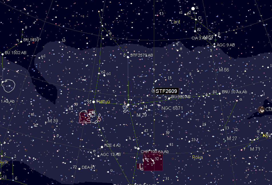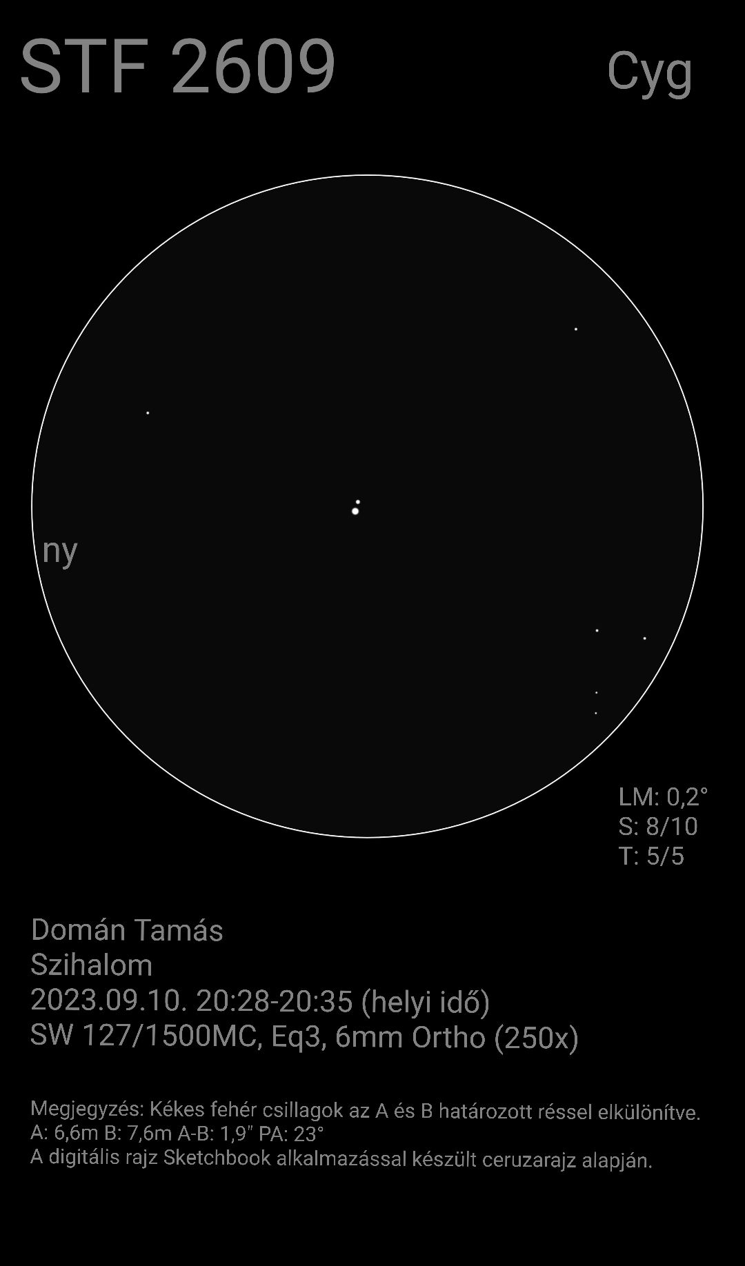 A kettős a Hattyú csillagképben található, szoros 2" alatti szeparációval rendelkezik. Kékes fehér színű páros. Felbontása nagy nagyítást igényel. Észleléskor határozottan, réssel bontott.