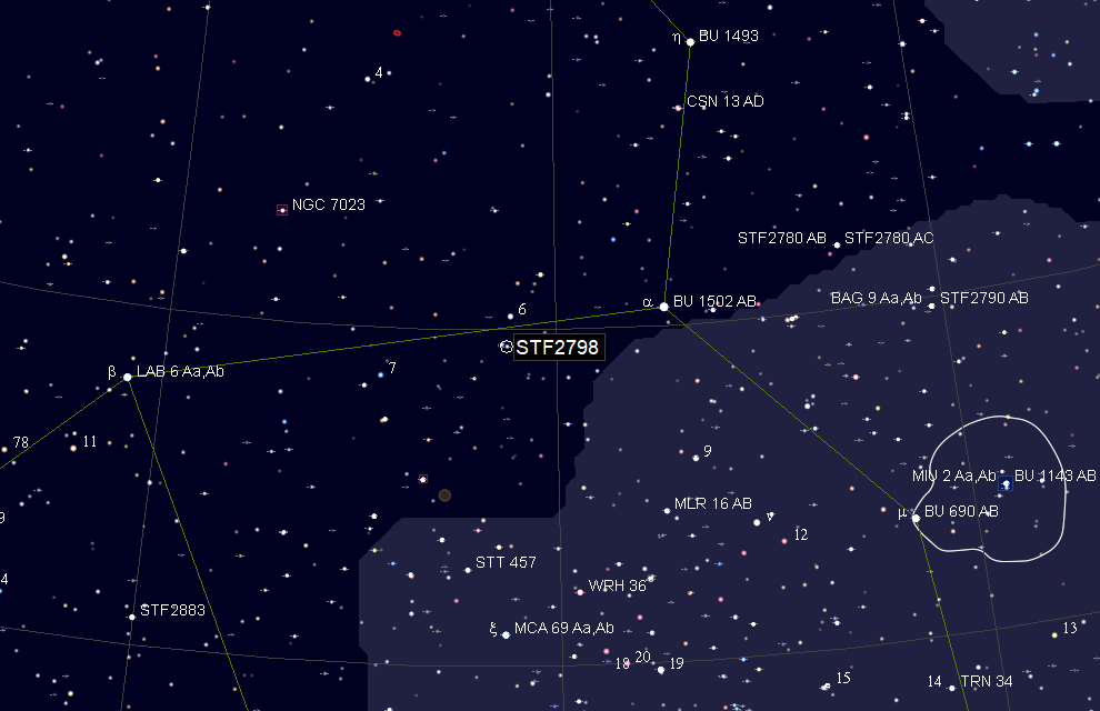Az STF 2798 egy könnyen megkereshető tág szeparációval rendelkező halvány kettős a Cepheus csillagképben. Közepes nagyítással már bontható. Színük fehér és vöröses.