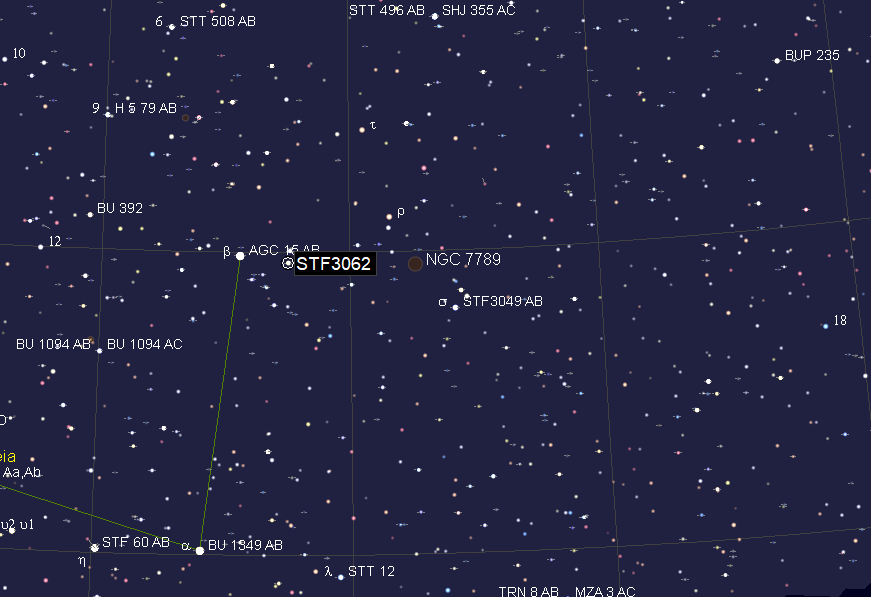 Az STF 3062 egy könnyen kereshető, de szoros kettős a Cassiopeia csillagképben. A sárgás pár felbontásához jó nyugodtság szükséges.