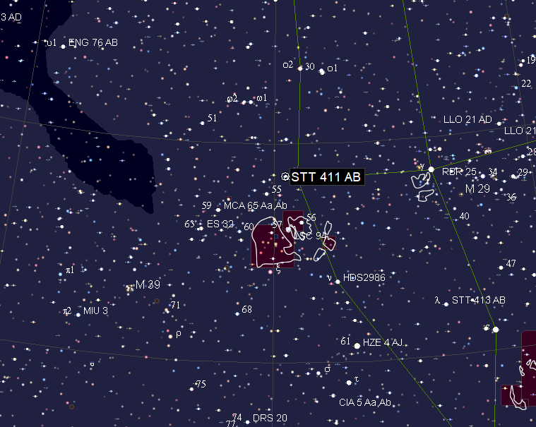Az STT 411 egy könnyen kereshető, már az alakjáról beazonosítható többes rendszer. Érdemes kistávcsővel is felkeresni, hiszen a tagok közti szeparáció nagy. Jól bontható. A nehézséget a halványabb tagok okozzák, amik sötét eget és nagy távcsövet igényelnek.