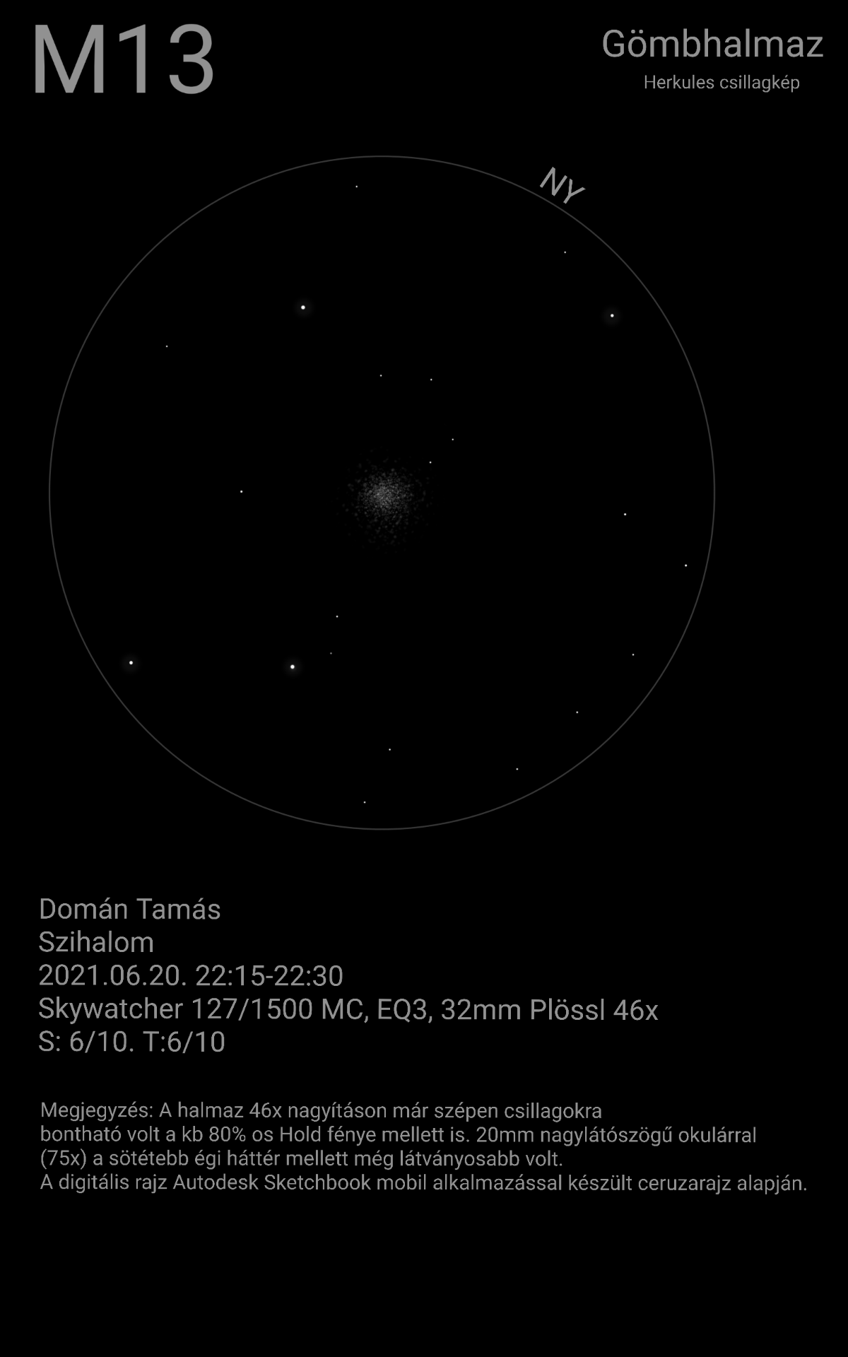 Az M13 az északi égbolt legfényesebb gömbhalmaza. Már közepes távcsővel is szép látványt nyújt a Herkules csillagképben, de binokulárral és kis távcsővel is észrevehető, igaz ezekkel egy homályos foltnak látszik. Megtalálása egyszerű. Nagyobb távcsövekkel rengeteg csillagra bomlik.